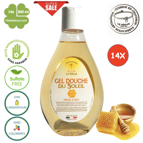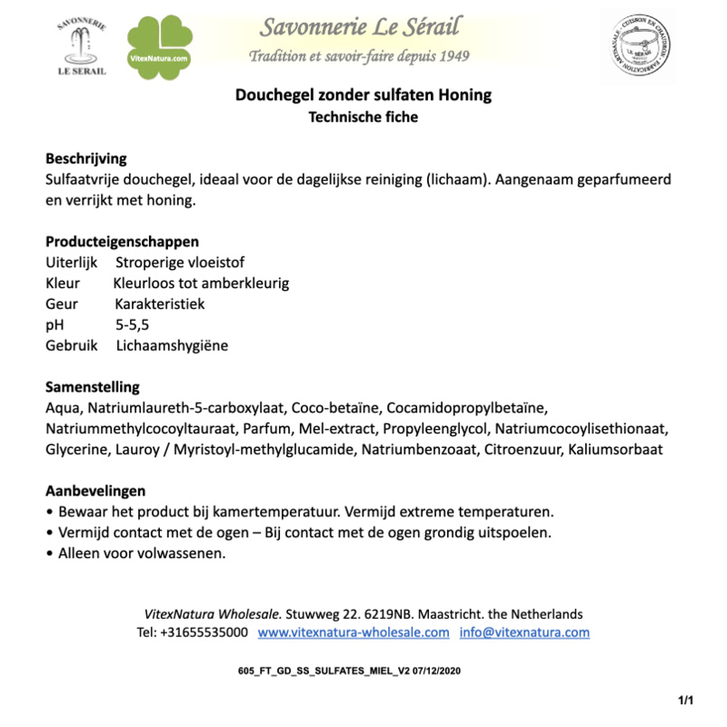 OverzichtSulfaatvrije douchegel, ideaal voor dagelijkse reiniging (lichaam). Aangenaam geparfumeerd en verrijkt met honing.